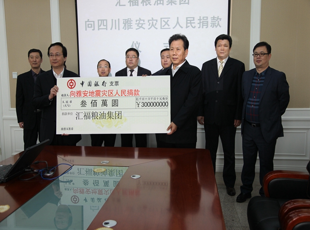 三河汇福粮油集团向雅安地震灾区捐款500万元,其中集团党委书记、董事长、总裁石克荣个人捐款200万元。