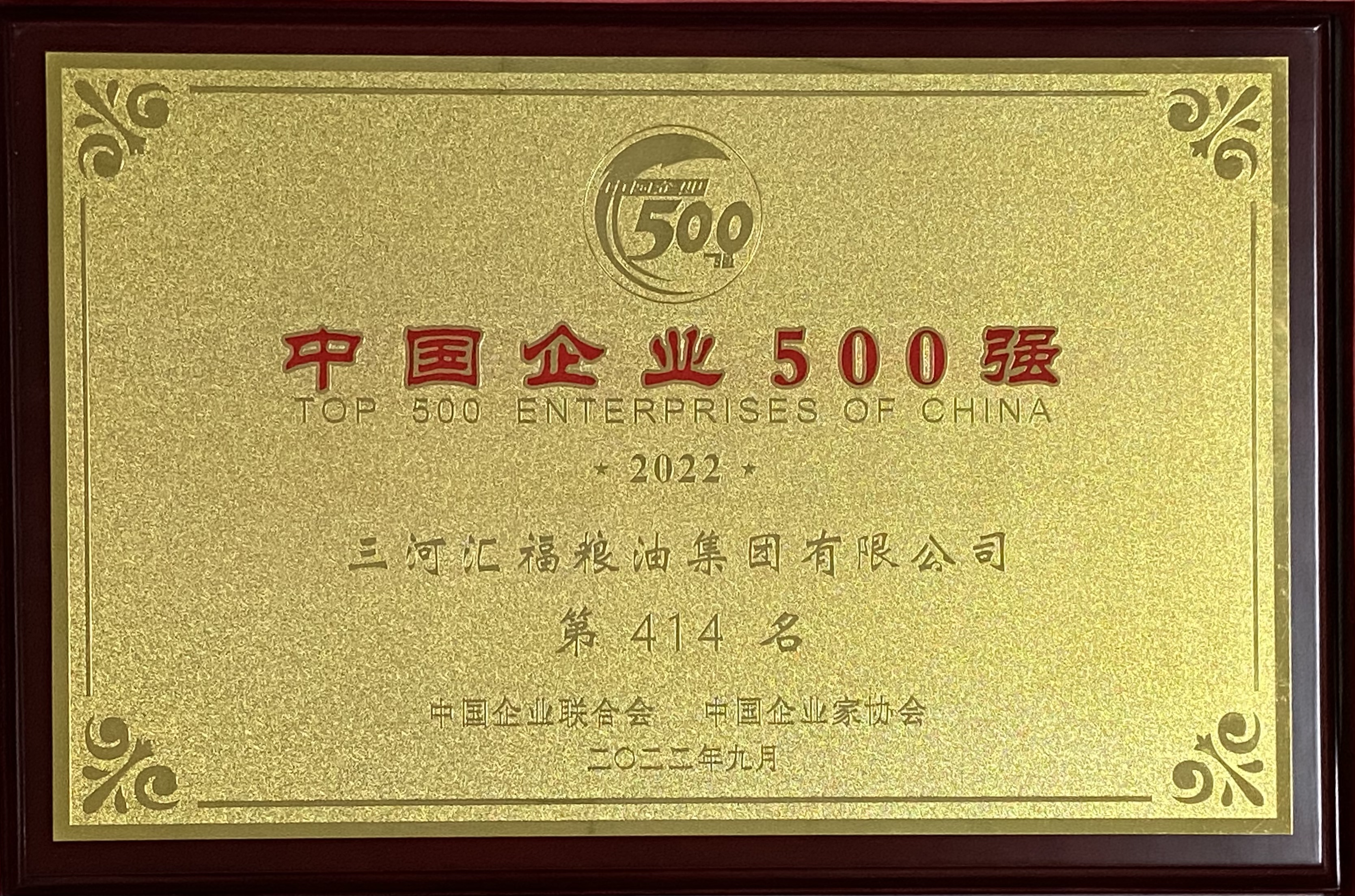 中国企业联合会、中国企业家协会9月6日发布“2022中国企业500强”榜单。在2022中国企业500强中,三河汇福粮油集团有限公司位列中国企业500强第414名,中国制造业企业500强第204名。